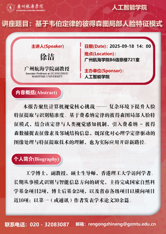 学术讲座预告:徐洁《基于韦伯定律的彼得森图局部人脸特征模式》