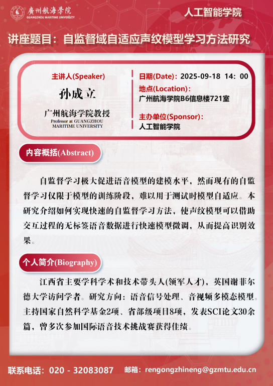 学术讲座预告:孙成立《自监督域自适应声纹模型学习方法研究》