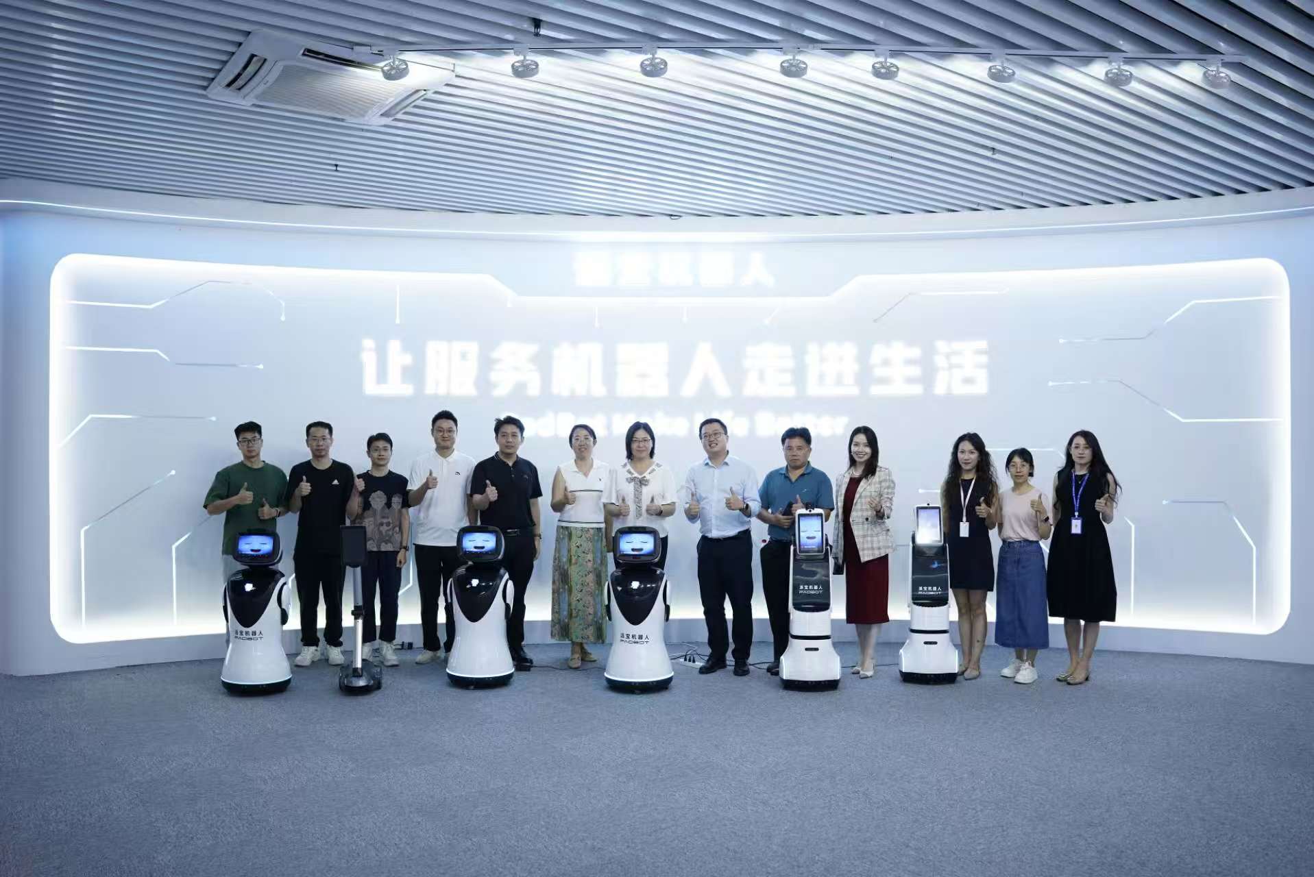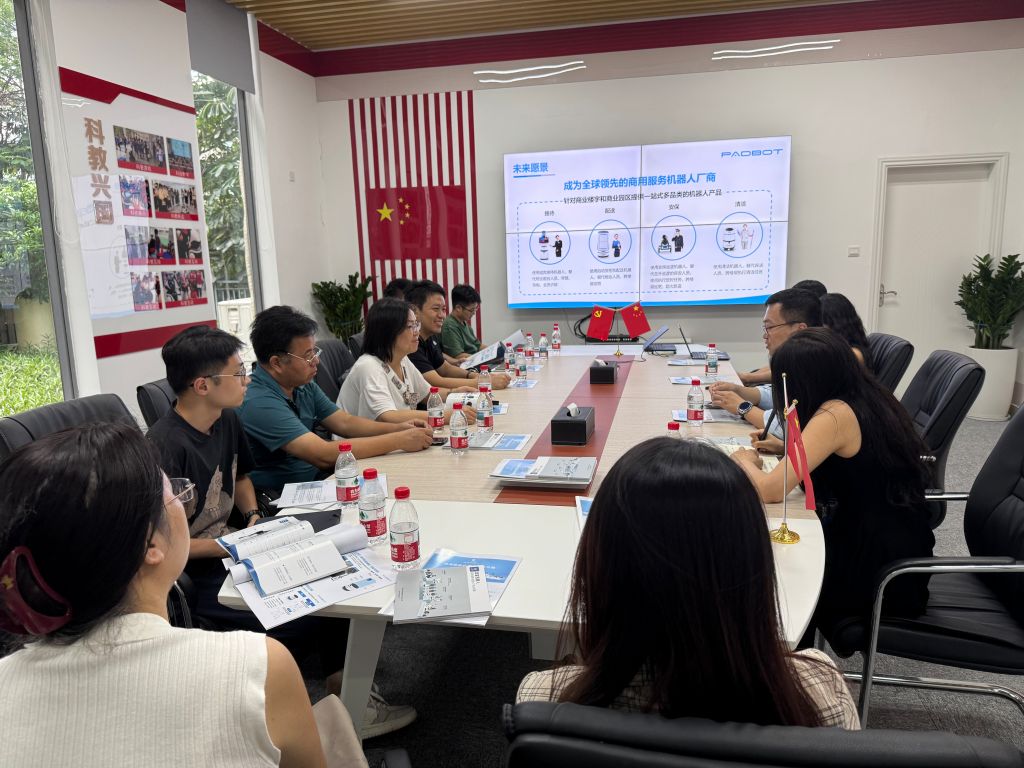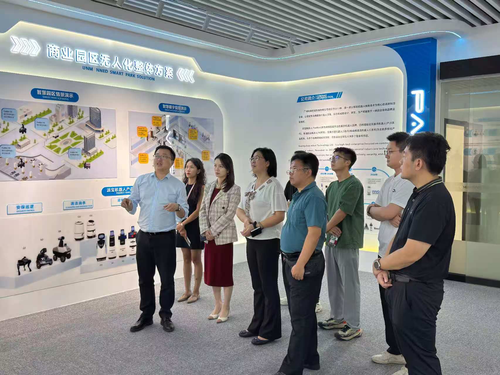 在映博智能机器人展示中心,向丹教授一行深入了解了派宝机器人在安防巡逻、物流配送、智慧清洁、迎宾导览等多样化场景中的实际应用,并对公司在高精度导航、多机协同及机器人云端中控平台等关键技术领域所取得的成果表示高度认可。