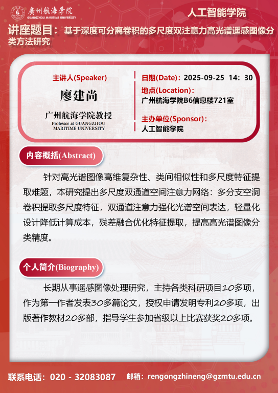学术讲座预告:廖建尚 《基于深度可分离卷积的多尺度双注意力高光谱遥感图像分类方法研究》